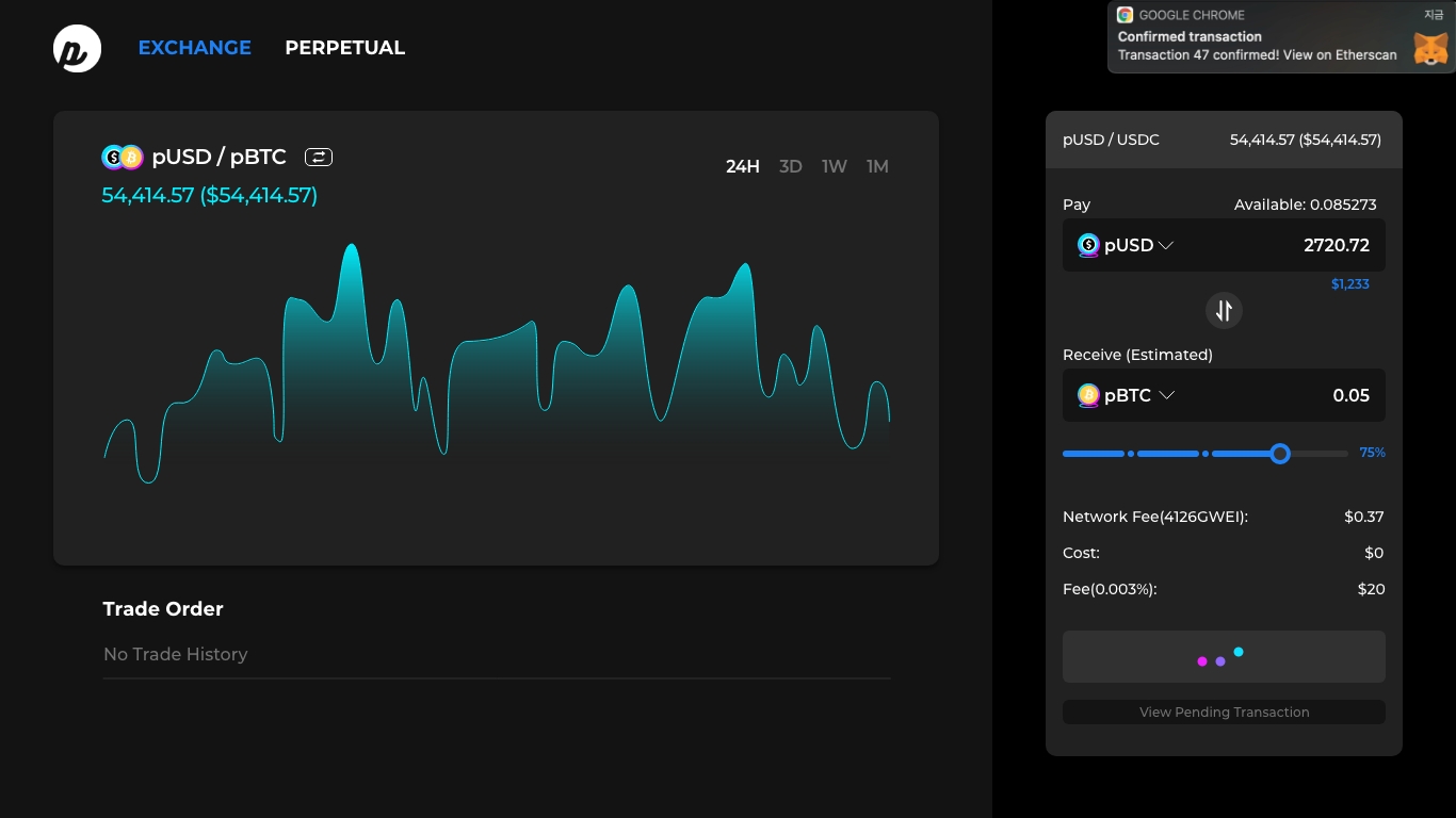 Step 6. After the trade is completed, alert and order history is displayed on the dApp.