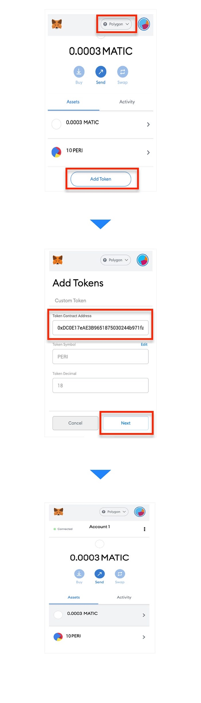 Click ‘Add Token’ button. And insert PERI contract address at Polygon: