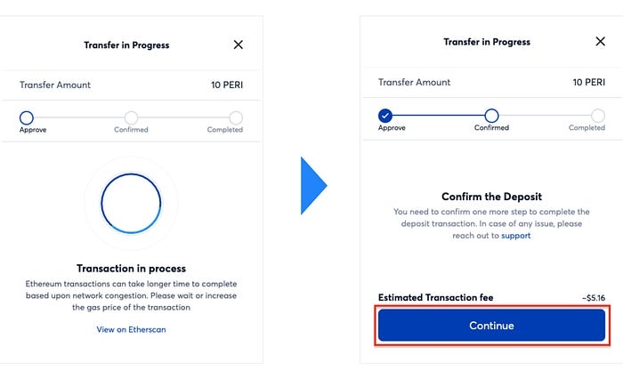 Step 6. Click ‘Deposit’ button to transfer PERI from Ethereum Mainnet to Matic(Polygon) Mainnet.