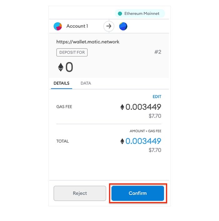 Step 12. At this point, your wallet will be asked for gas fee to transfer into polygon network. Check the gas fee and click the ‘Confirm’ button.