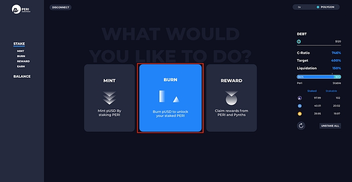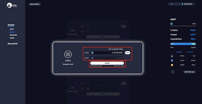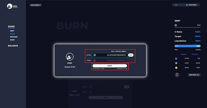 Note — For users who staked both PERI and Stablecoin(USDC, DAI) If users who staked PERI and other kinds of stablecoin, you should maintain the staking ratio(PERI 80% : other stablecoin 20%)on the staking dApp. So, if you unstake all amount in the dApp, you should burn pUSD by stablecoin first.