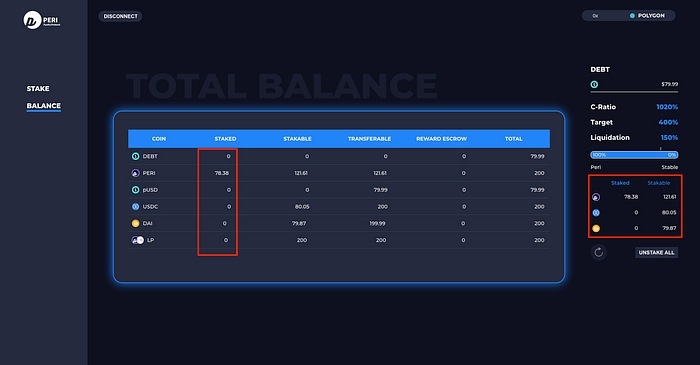 Note — For users who staked both PERI and Stablecoin(USDC, DAI) If users who staked PERI and other kinds of stablecoin, you should maintain the staking ratio(PERI 80% : other stablecoin 20%)on the staking dApp. So, if you unstake all PERI amount in the dApp, you should burn pUSD by the stablecoin first.